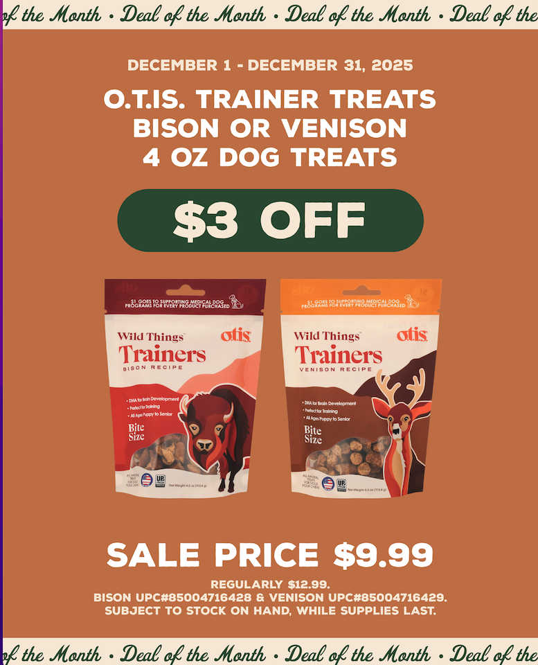December Deal of the Month: $3 Off O.T.I.S Trainer Treats! (Bison or Venison Flavors)